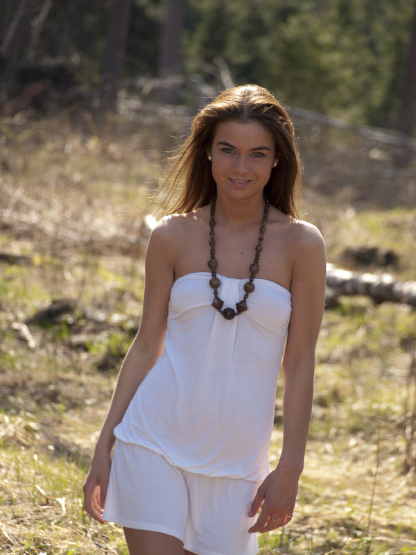 Симпатичная девченка с бусами гуляет на природе, демонстрируя свое тело.