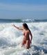 На фоне больших волн. Её обнаженное тело классно смотрится.