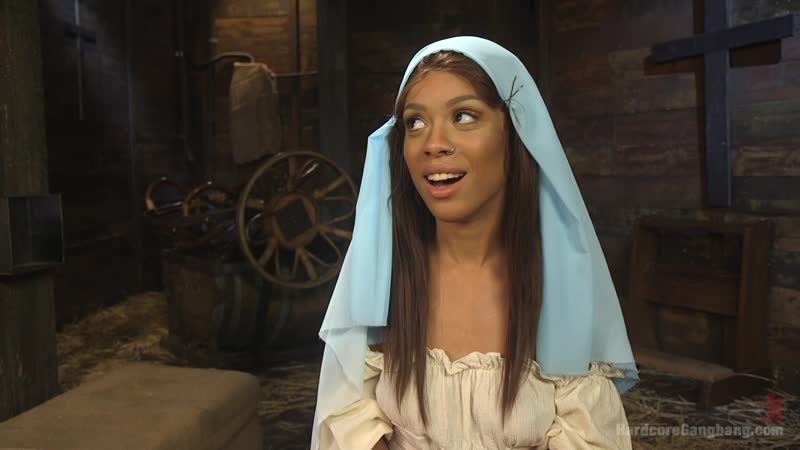 Темнокожая девушка с пирсингом в носу пришла на съемки в порно. Она была одета, как крестьянка, потому что будет сниматься в тематической порнухе, где ее будут трахать грубые мужики. Она ведет себя, как шлюха, наслаждается замечательными мужскими фаллосами, которые ее окружают, а мужики даже используют веревку на ее шее. Агрессивная шалава даже почувствует двойное проникновение в анал, а мужики будут рвать ее рот пальцами, обкончав всю ее с ног до головы. От этой крестьянской групповухи на сеновале у нее только положительные впечатления.
