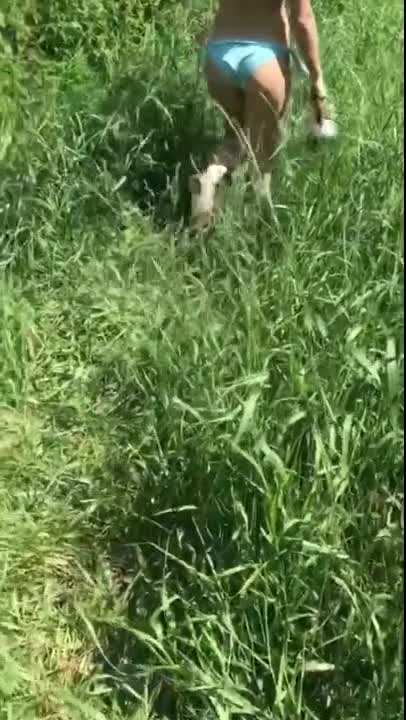 Парень трахает девушку в голубом купальнике на зелёной лужайке