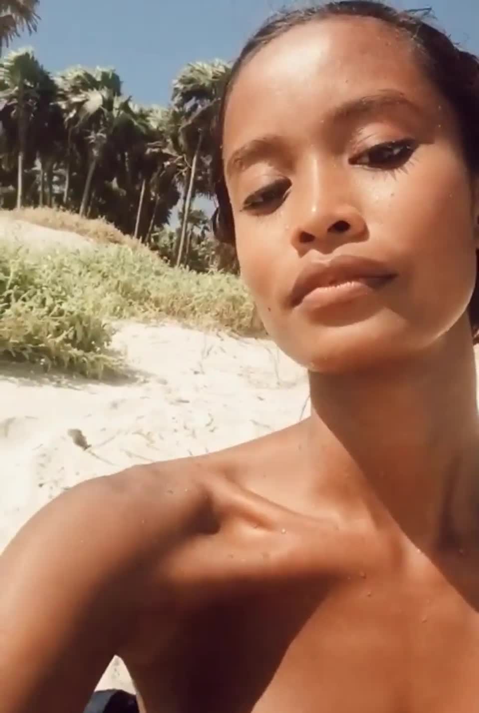 Девчушка-шоколадка, показывает свое сладкое тело.
