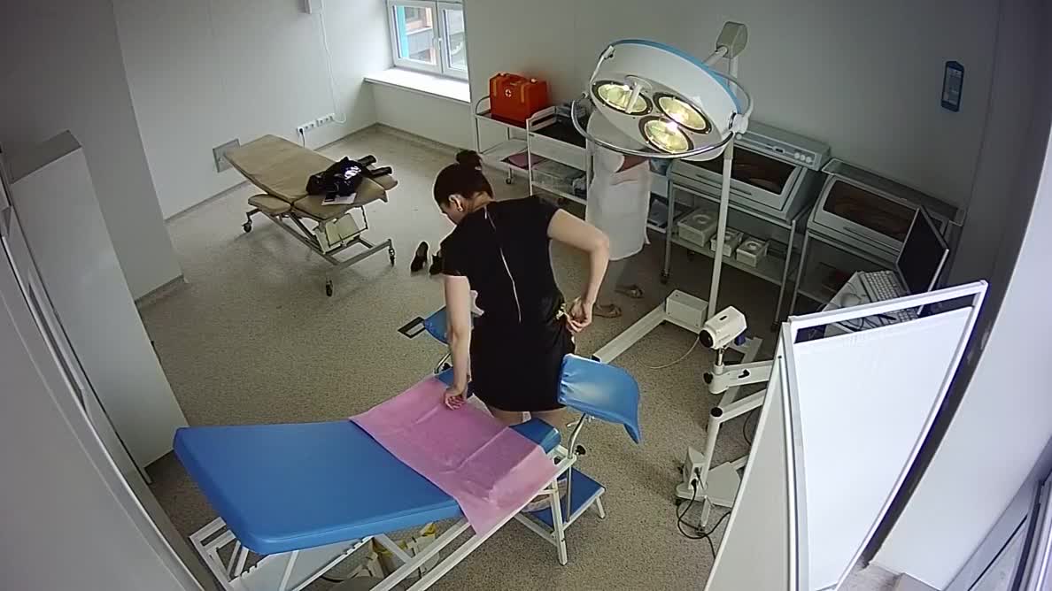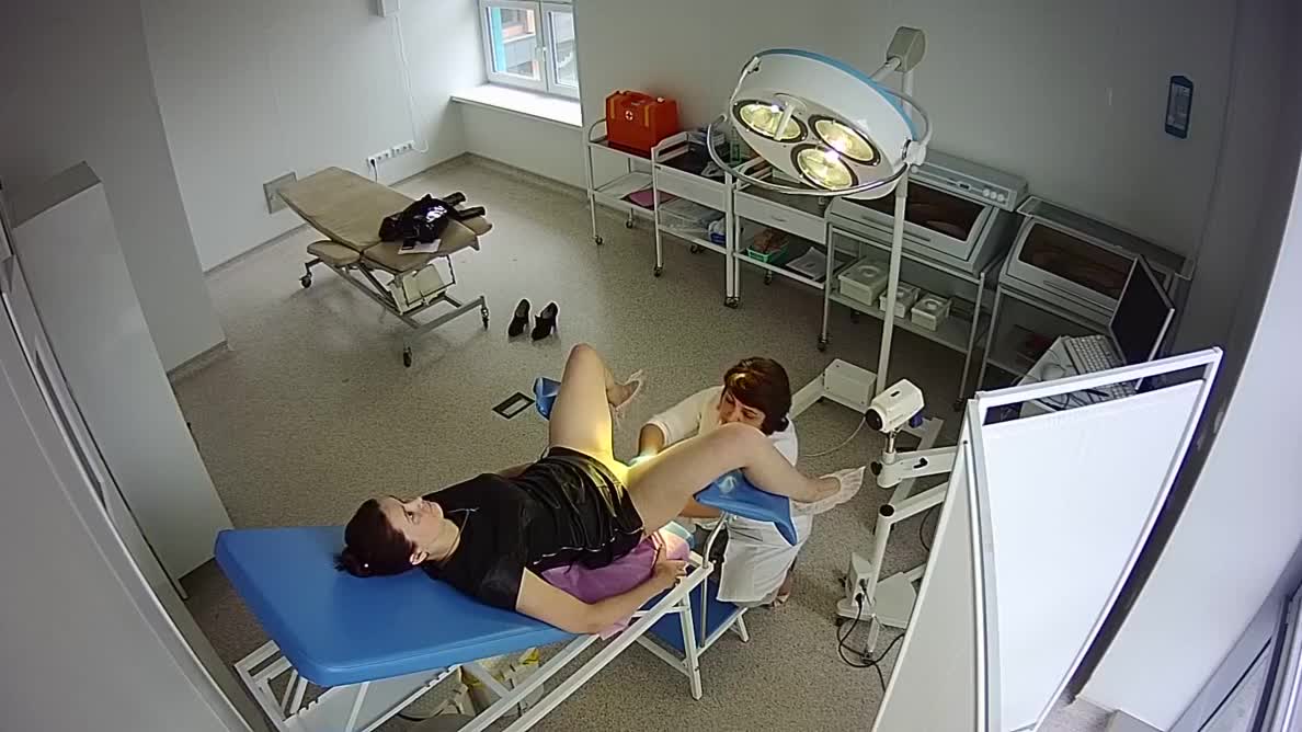 Осмотр красивой девушки на геникологическом кресле в поликлинике.Процедуру снимает скрытая камера.