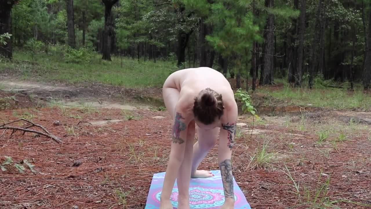 Хороши сиськи у голой татуированной девушки занимающейся на опушке леса то ли йогой, то ли гимнастикой.