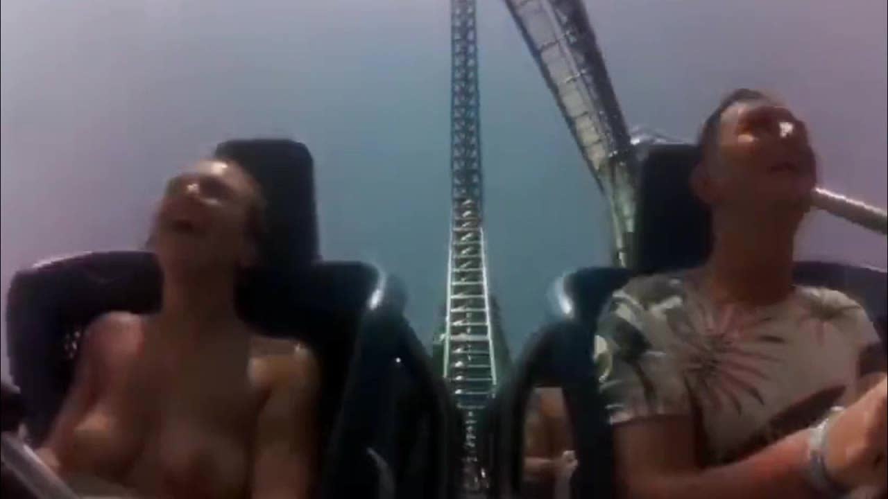 Сиськи у девушку вышла из платья, пока она катается на аттракционе в луна-парке и это развлекает ее.