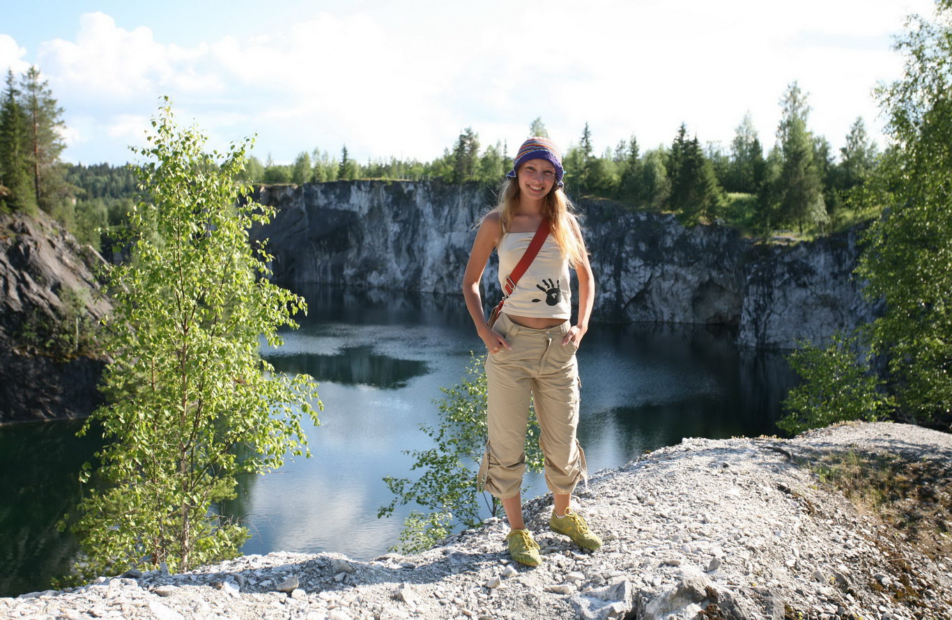 Какое прекрасное сочетание русской красоты ! Маша на фоне Карельских гор и горного озера ничуть не портит картину общего пейзажа нашей природы !
