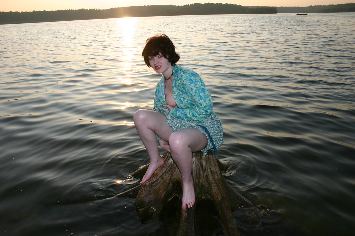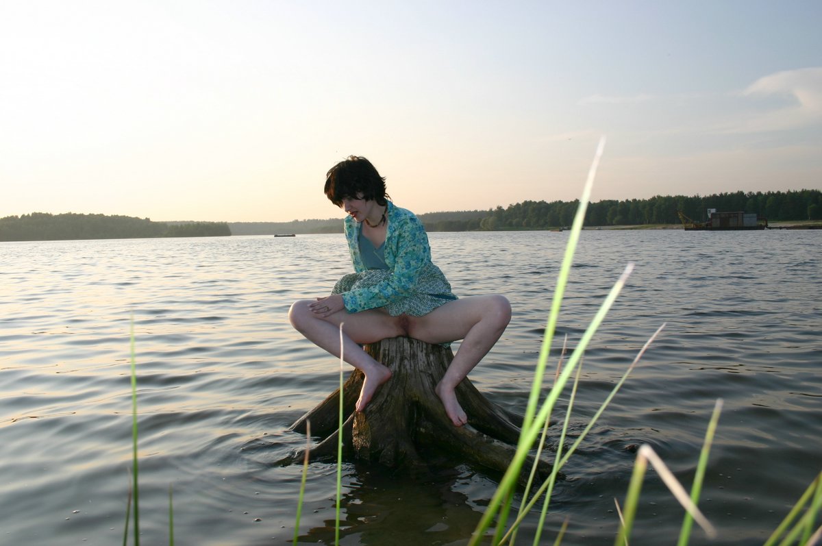 Красотка позирует, сидя на пеньке и раздвинув ножки