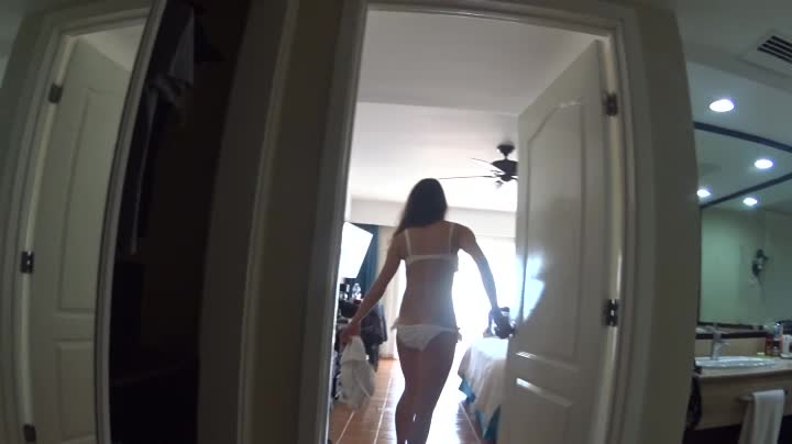 она снимает свой белый купальник