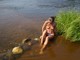 Красиво худенькая девушка позирует топлес на берегу речки!
