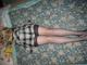Развратница откровенно позирует в сетчатых чулках и клетчатой юбке.