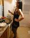 Брюнетка позирует в чёрном нижнем белье в комнате, на кухне и на любимой кроватке.