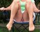 Дамочка с прекрасной фигурой демонстрирует свое загорелое тело, попочку и киску. Светит прелестями дома и на улице.
