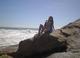 Красивая и яркая женщина гармонично вписывается в морской пейзаж.