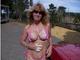 Очаровательная блондинка в розовом купальнике и ее красная машина классно смотрятся!