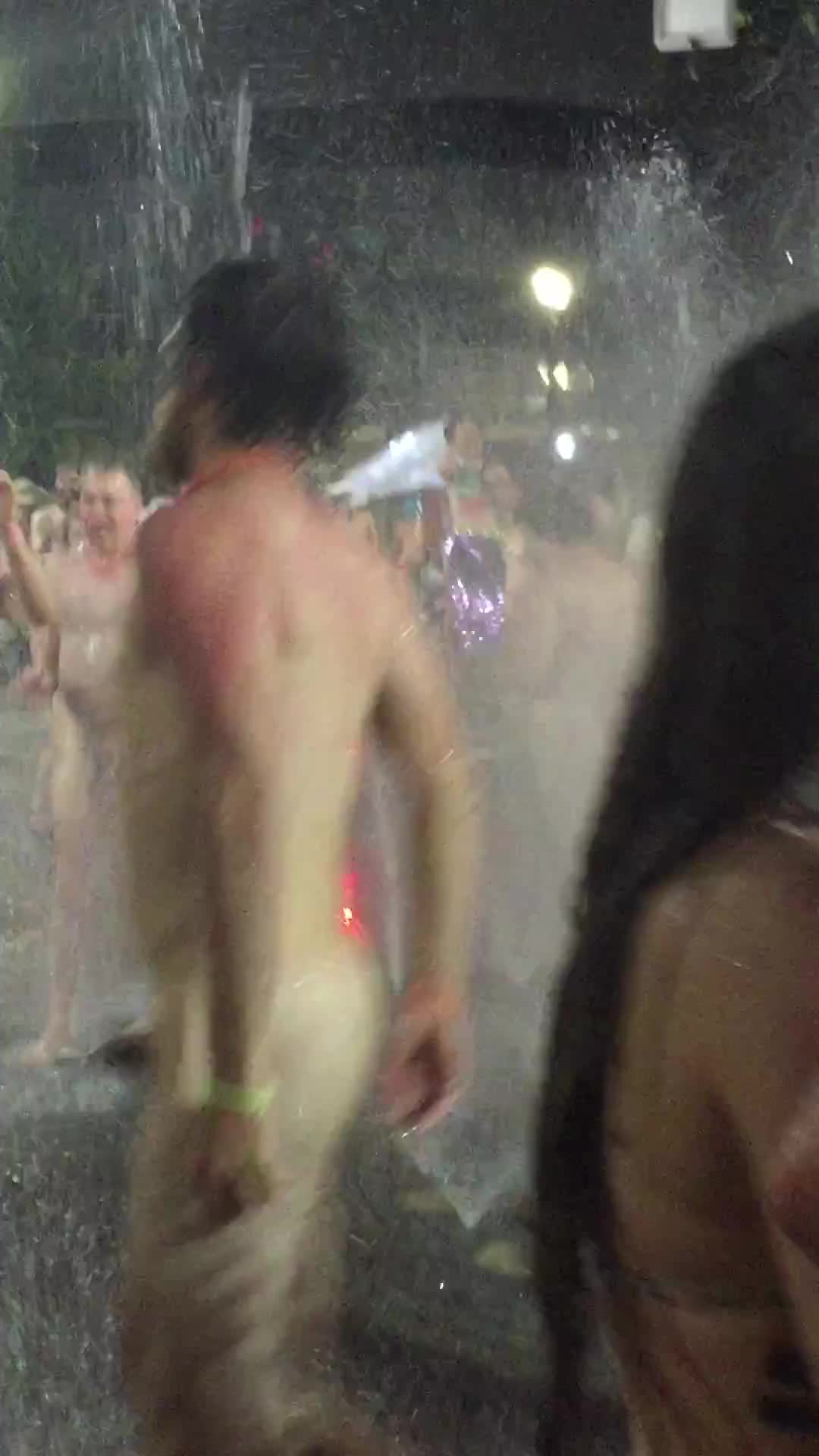 Какие-то нудисты танцуют вечером в фонтане.