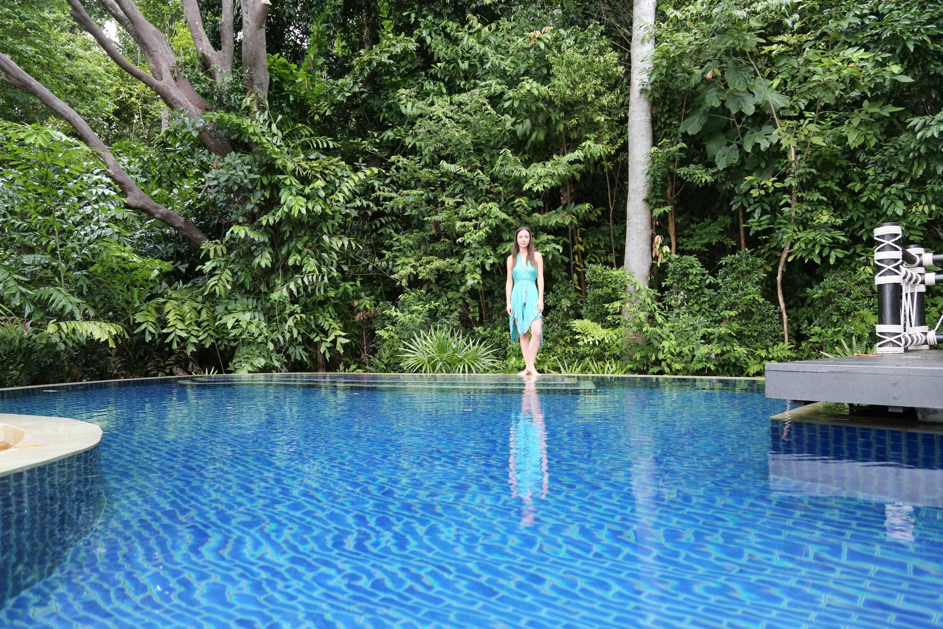 Фото сессия с двумя девушками в бассейне одна полностью голая вторая в синем платье.