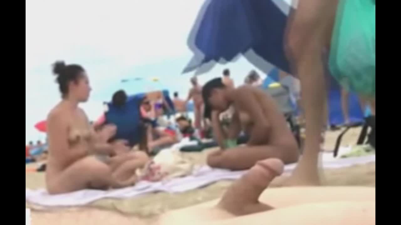 на вроде,ненудистском пляже разговаривают две обнаженные девушки, а чувак кончил просто смотря на них.