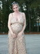 Счастливая беременная женщина в лёгком сарафане ранним утром в парке.