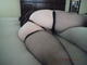позирует в чёрных чулках в сеточку и трусиках с разрезом демонстрируя свою киску и попку.