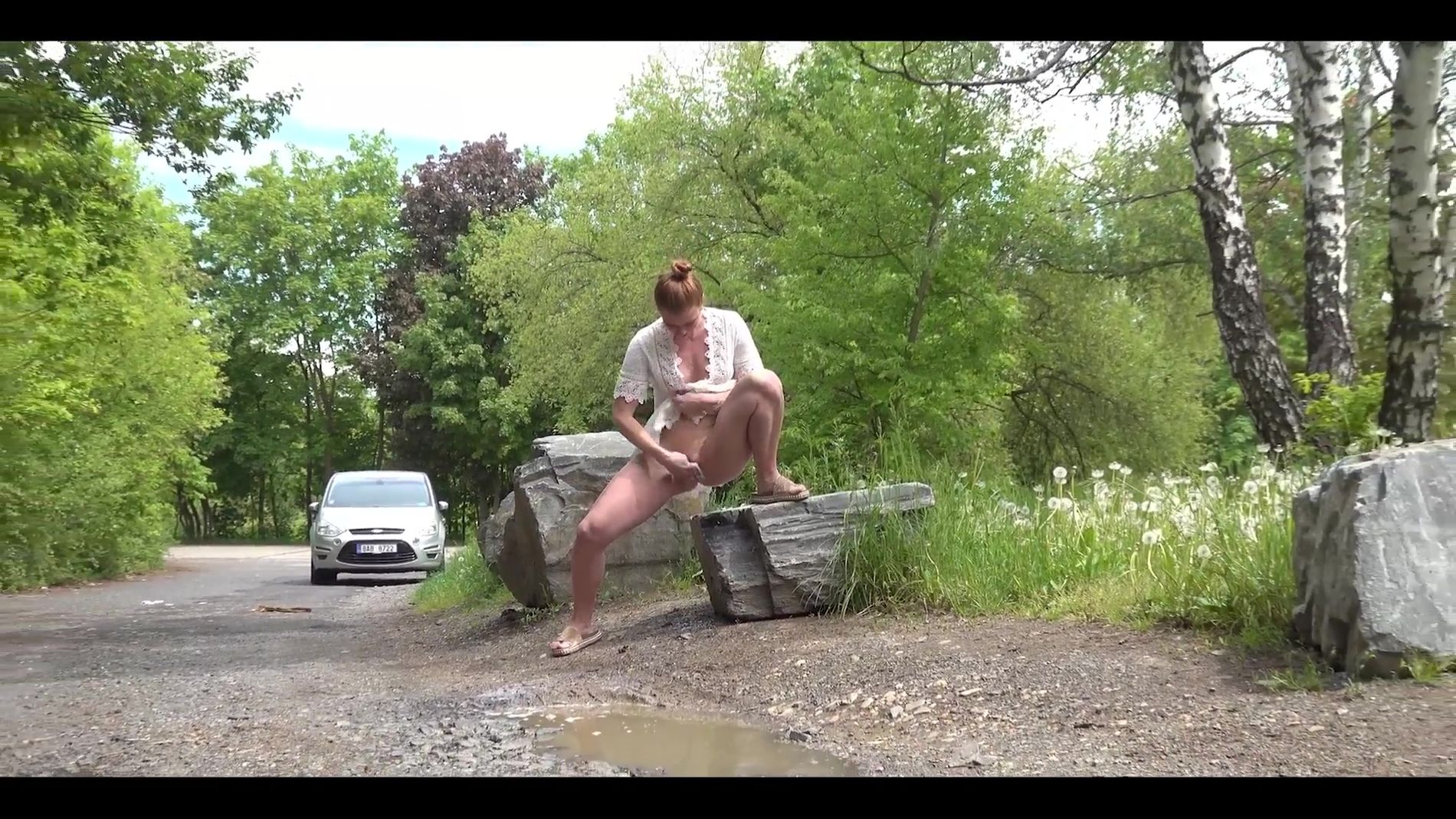 Эффектная девушка чуть ли не гимнастическим образом картинно сцыкает у дороги. Ноги расставила о-очень широко - это чтобы нам лучше было видно её мокрую киску. Хороша мокрощелка, не так ли? Приятного просмотра.