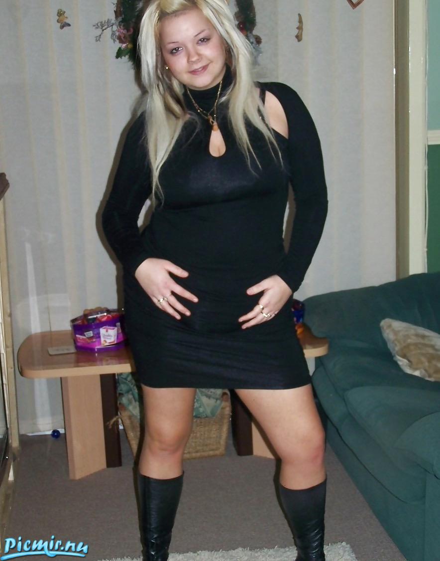 Секси фотосессия от пышной блондинки в черном платье.