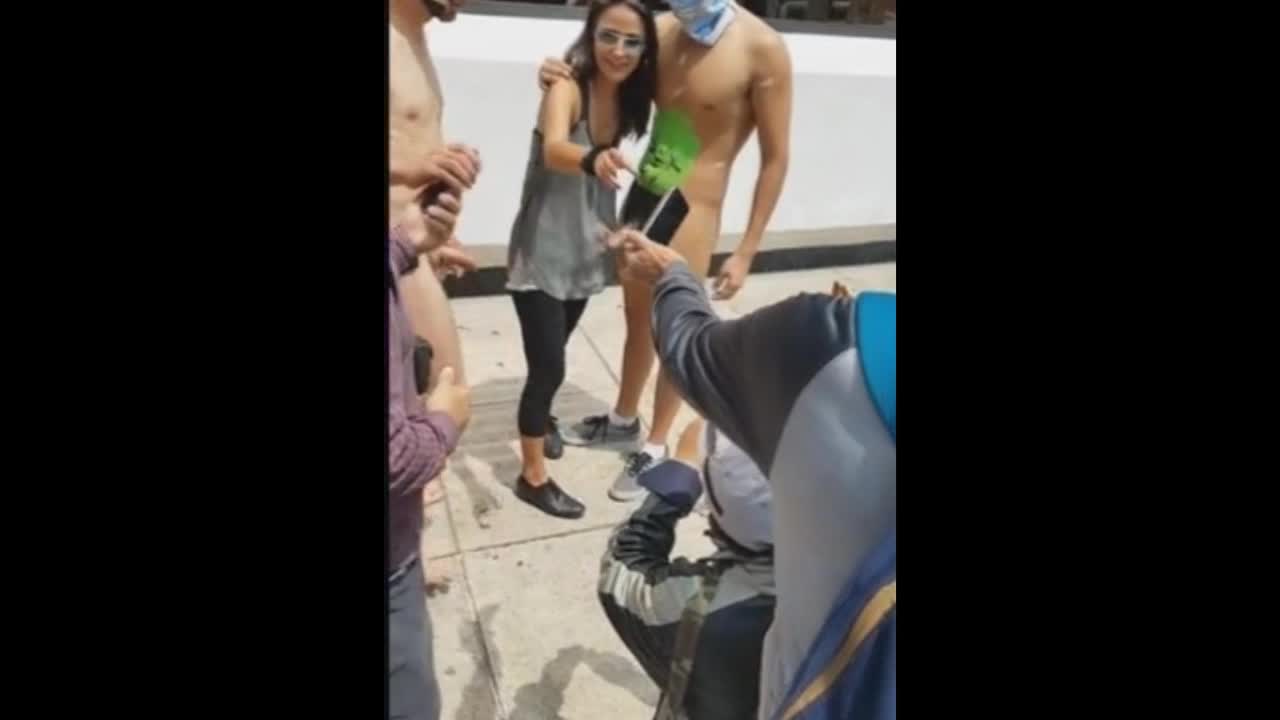 Девушка фотографируется на улице в Испании с двумя парнями с большими членами.
