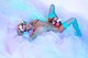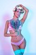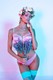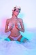 в сексуальном наряде и голубых чулках, на красивом фоне показывает нам красоту своего обнаженного тела