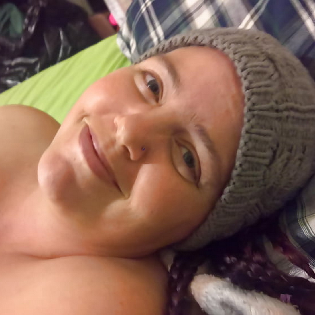 Пышнотелая женщина в своей кровати готовится ко сну.