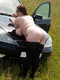 Пышка на лугу показывает себя рядом с машиной.