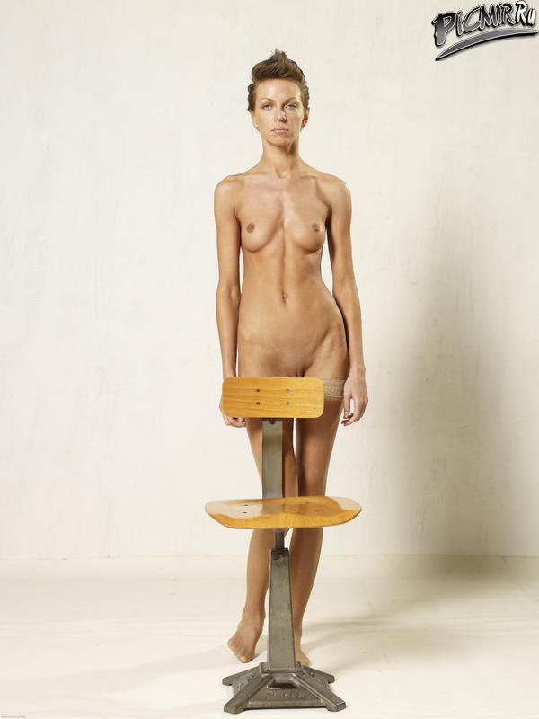 голая красотка позирует с короткой стрижкой и в чулках телесного цвета на стульчике