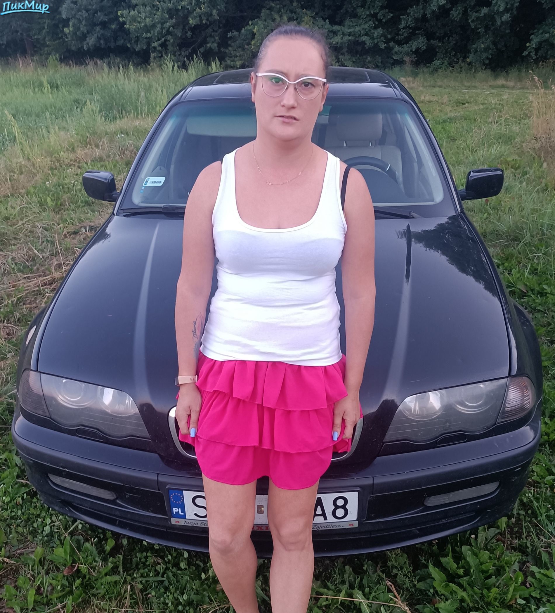 Шлюховатая жена Джоанна показывает свою киску на капоте BMW
