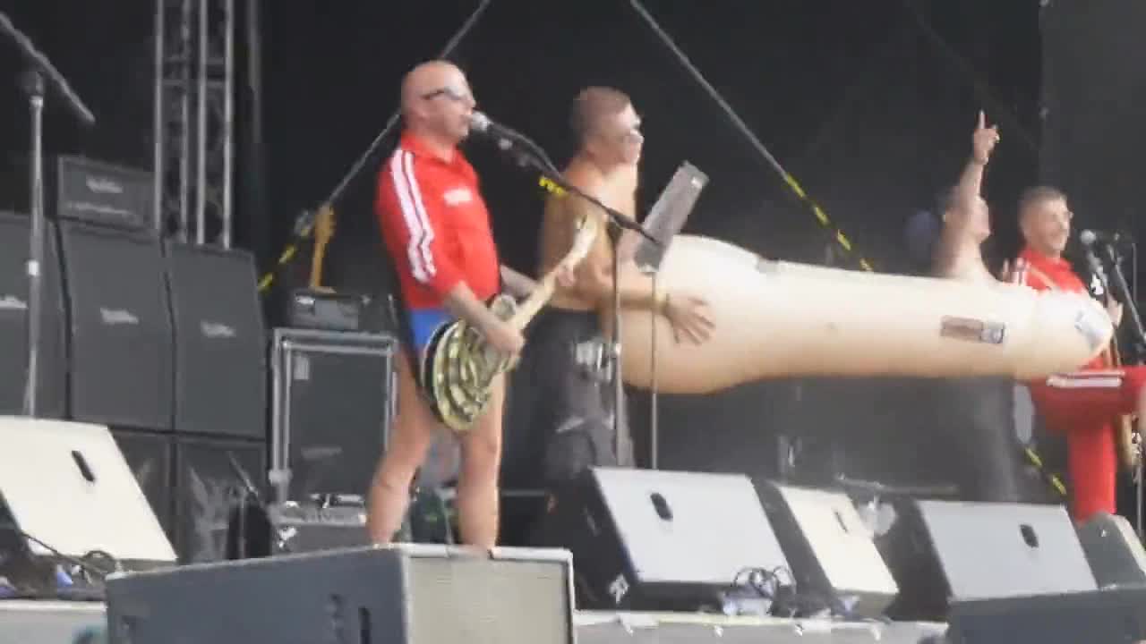 Пока группа играет на сцене, выходит фанатка с голой грудью и танцует на радость публике.