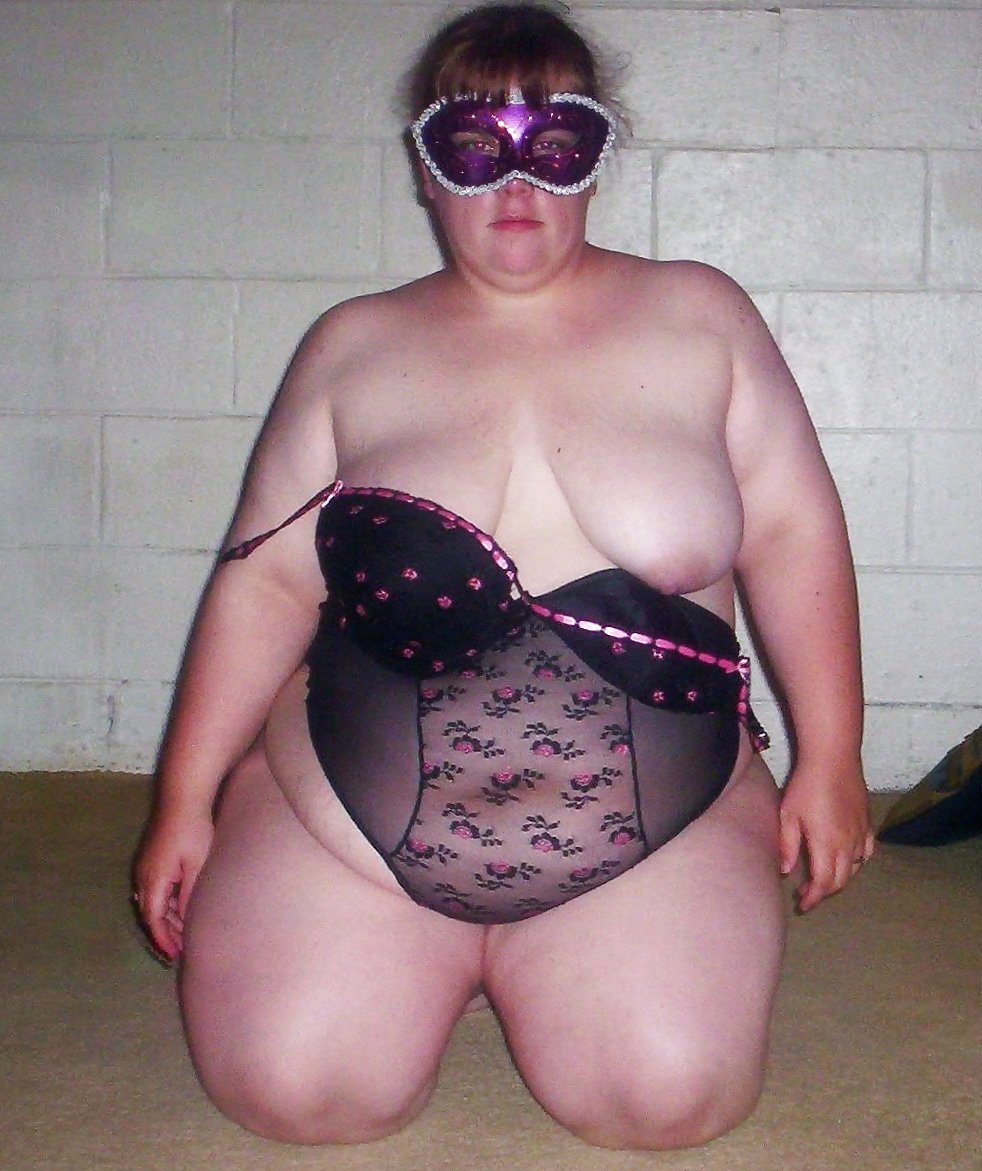 Крупногабаритная дама в маске позирует в чулках и корсете.