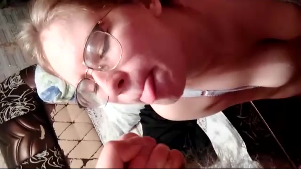 красивой девочке в очках дали в рот и кончили на губы