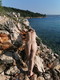 Женщина позирует на фоне моря и гор обнажённой