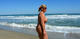 Дама с потрясающей грудью прогуливается по пляжу и позирует)