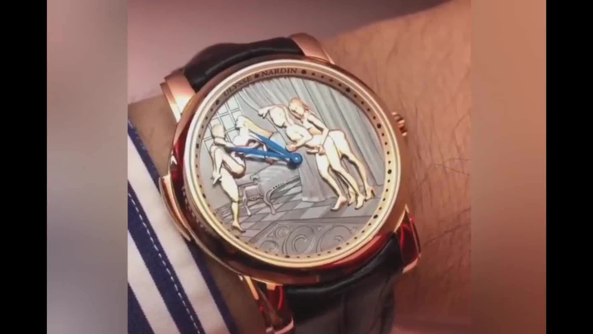 Веселые наручные часы со трахащиемся человечками на на циферблате .