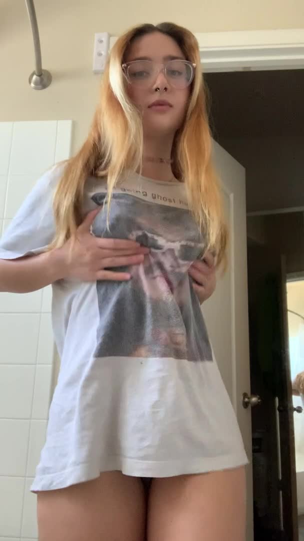 Всё красиво и очень привлекательно под футболкой у этой девушки в очках!
