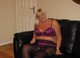 Зрелая блондинка-толстушка моделирует нижнее белье и колготки на кожаном диванчике