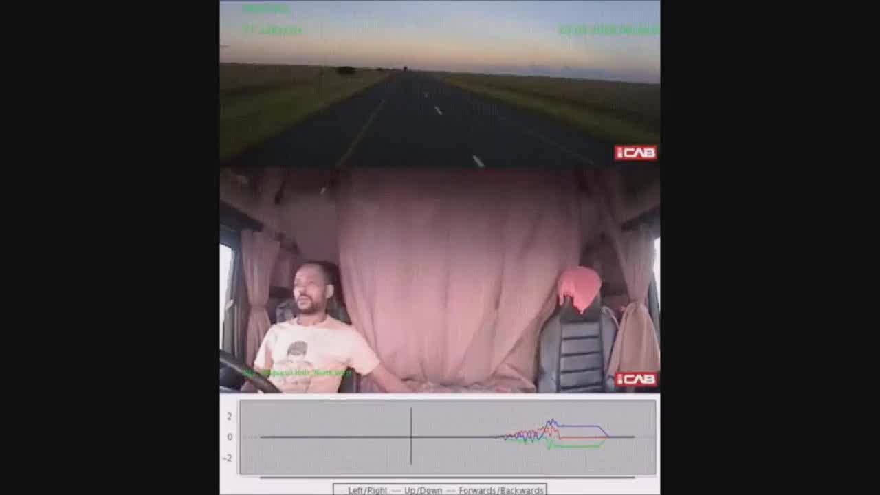 Водитель грузовика засыпает и уходит с дороги,от вибраций обнаженная женщина падает от кровати за спиной водителя.
