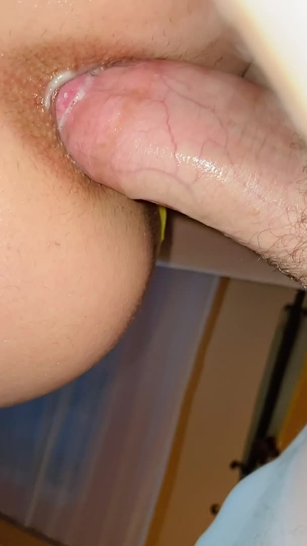 трахает в попку и кончает крупным планом, сперма вытекает из дырочки