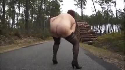 Зрелая дама в маске и чулках позирует на дороге
