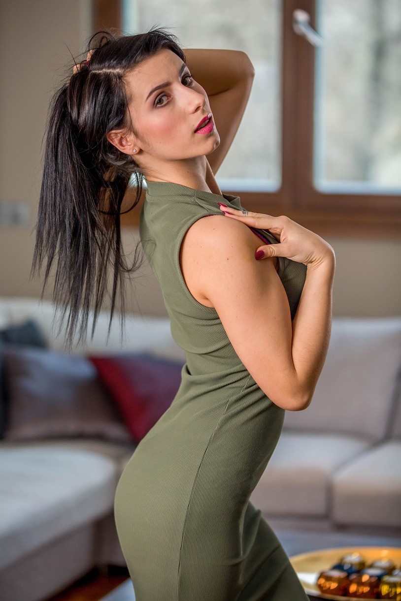 Шлюховатая брюнетка снимает короткое платье, чтобы обнажить свои маленькие сиськи