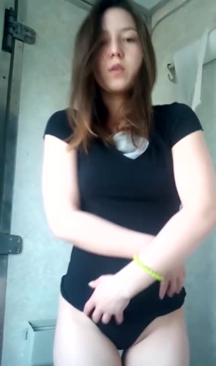 брюнетка снимает ролик своей мастурбации прямо в туалете поезда