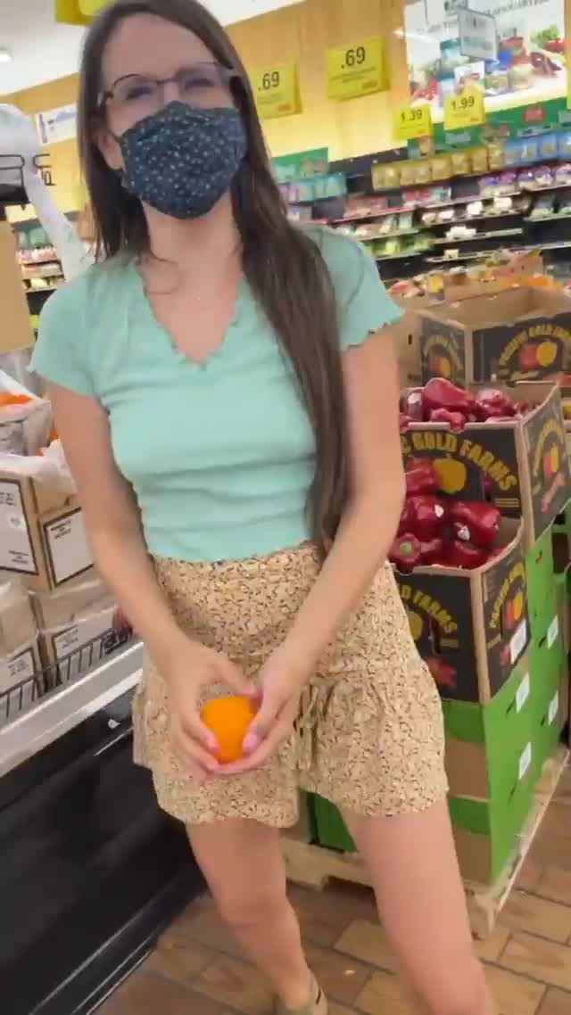 В магазине засовывает себе в пизду апельсин а потом и здоровый огурец.