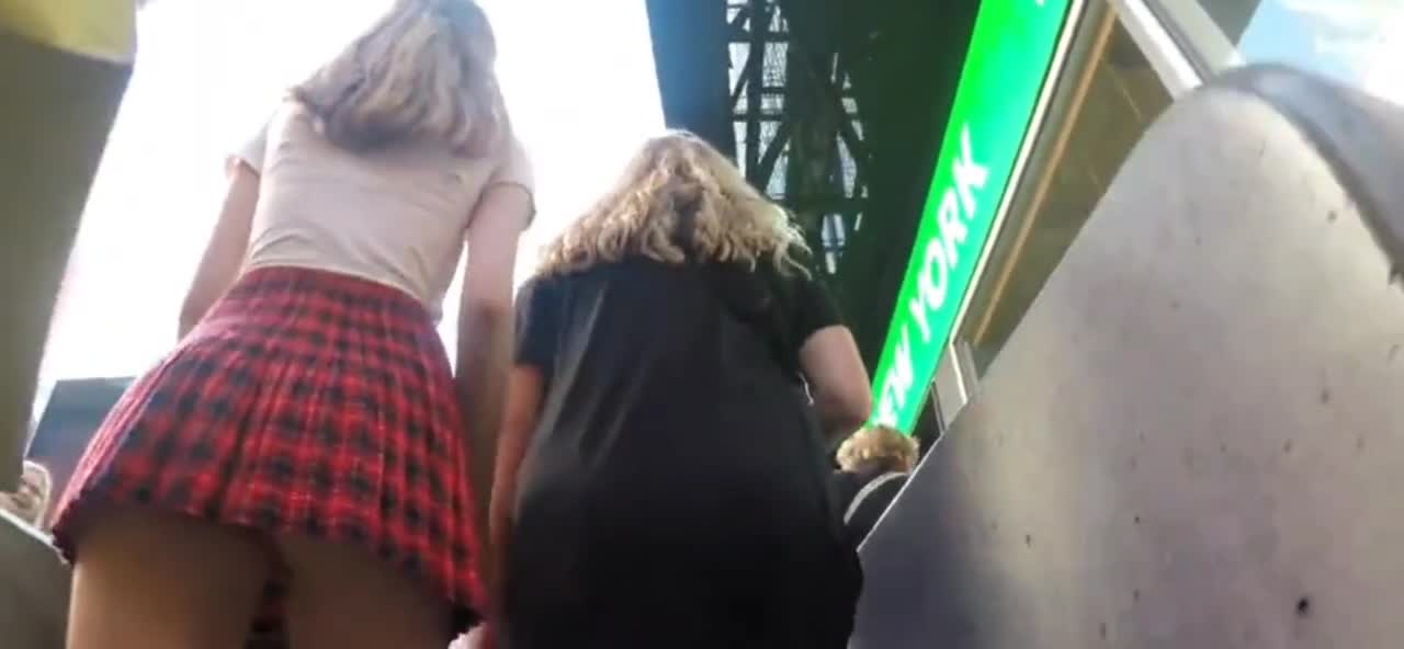 Преследуют девушку в клетчатой юбочке и снимают что под юбочкой у ней