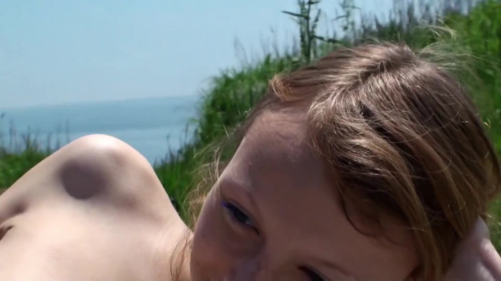 Молодая девушка с большой грудью загорает на травянистом пляже