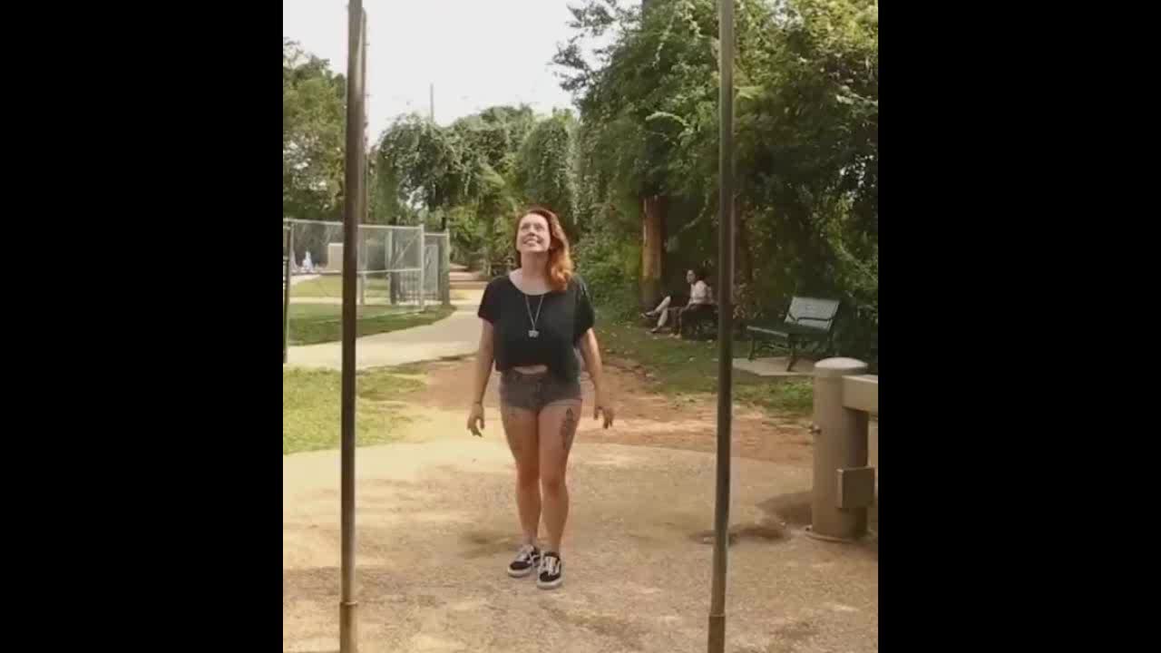 Молодая девушка прыгает и хватается за рычаг, ее большие сиськи выскакивают и трясутся.