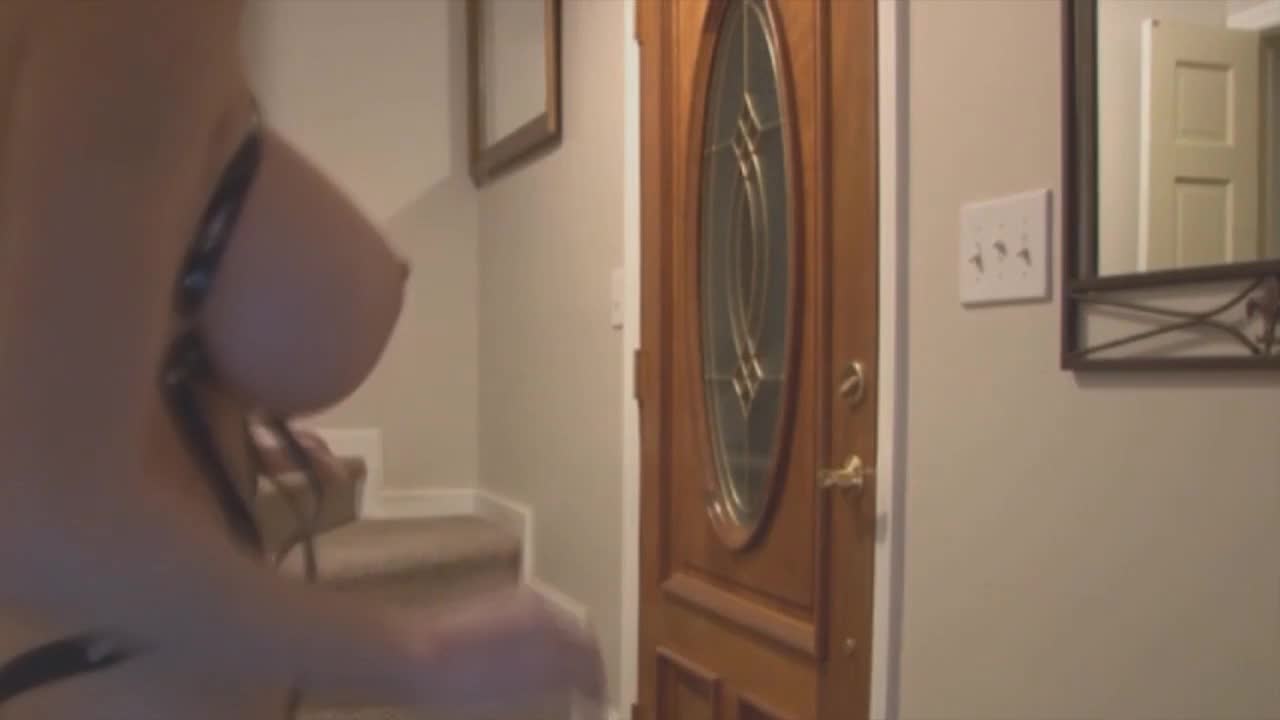 симпатичная молодая девушка с большими сиськами и в эротическом костюме встречает доставщика пиццы.