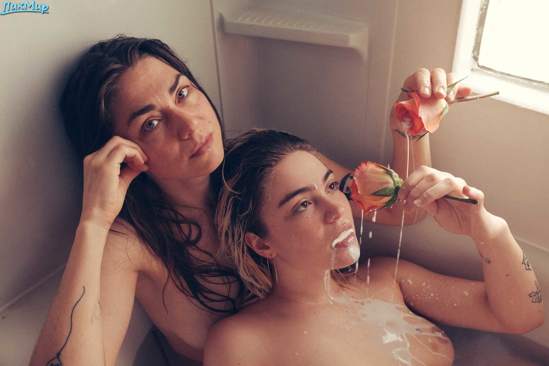 две веселые девушки устроили эротическую фотосессию с налепленными на них цветами, в ванне, полной молока и в длинных носках.Попробуйте понять, в чем их посыл.Я не понял.