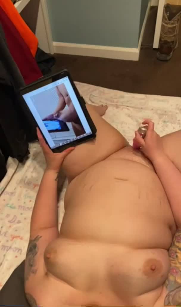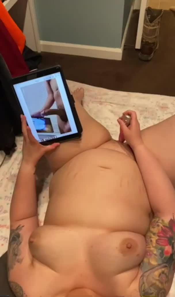 Полная девушка мастурбирует на видео дрочащего парня